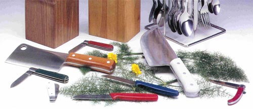 Laminas em aço ao carbono com alto poder de corte tratado para uma superior dureza. Cabos em faia, pinho, ou plástico...